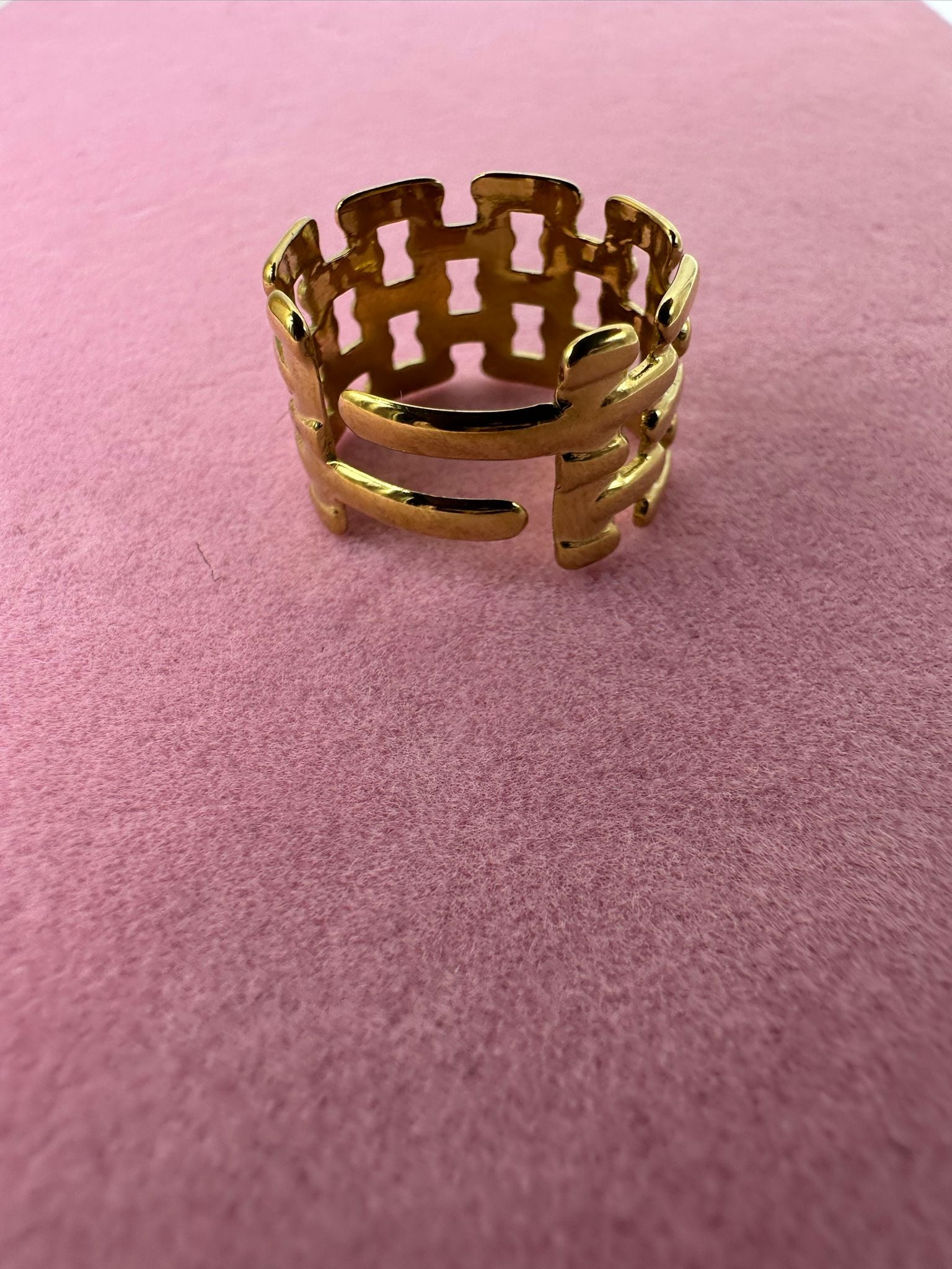 Anello statement a fascia larga in acciaio inossidabile con design a maglie rettangolari intrecciate. Disponibile in finitura oro e silver. Stile bold e moderno, perfetto per un look audace e contemporaneo. Anallergico, resistente e confortevole. Accessorio di tendenza per ogni occasione.