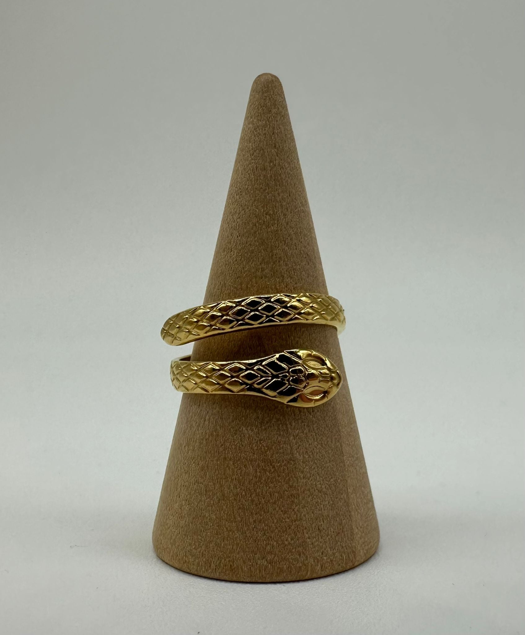Anello serpente avvolgente in acciaio inossidabile dorato con smalto nero e texture squame. Design simbolico e audace, regolabile. Stile rock e contemporaneo.
