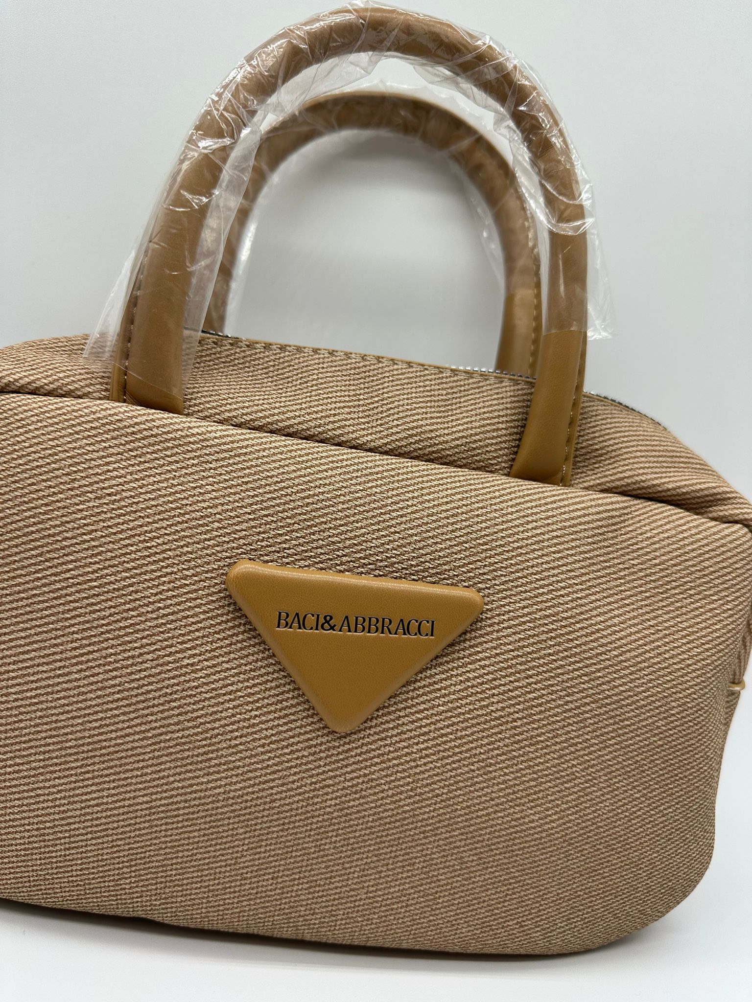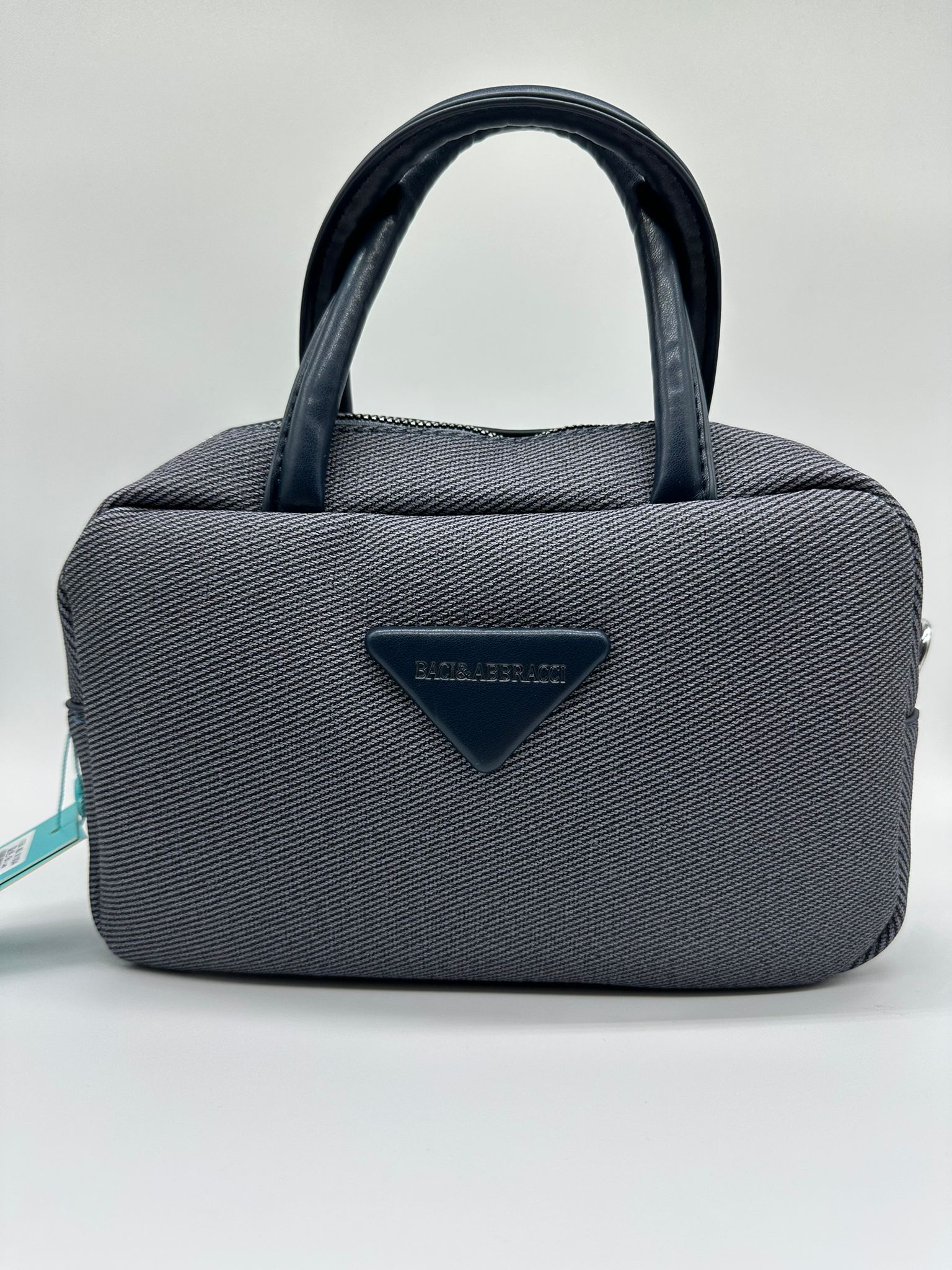Borsa a mano elegante in tessuto resistente con texture diagonale e logo triangolare distintivo. Manici rigidi, chiusura zip e design strutturato. Perfetta per uso quotidiano.