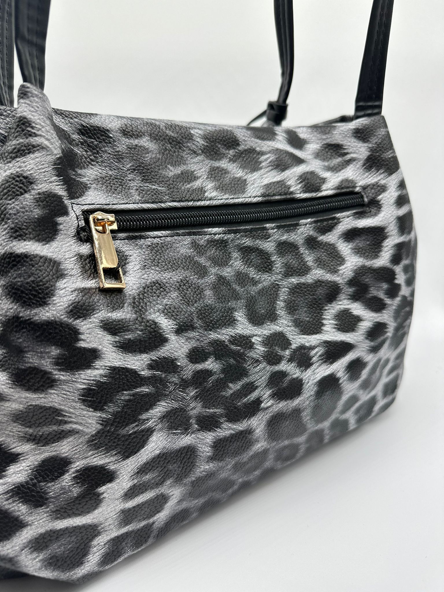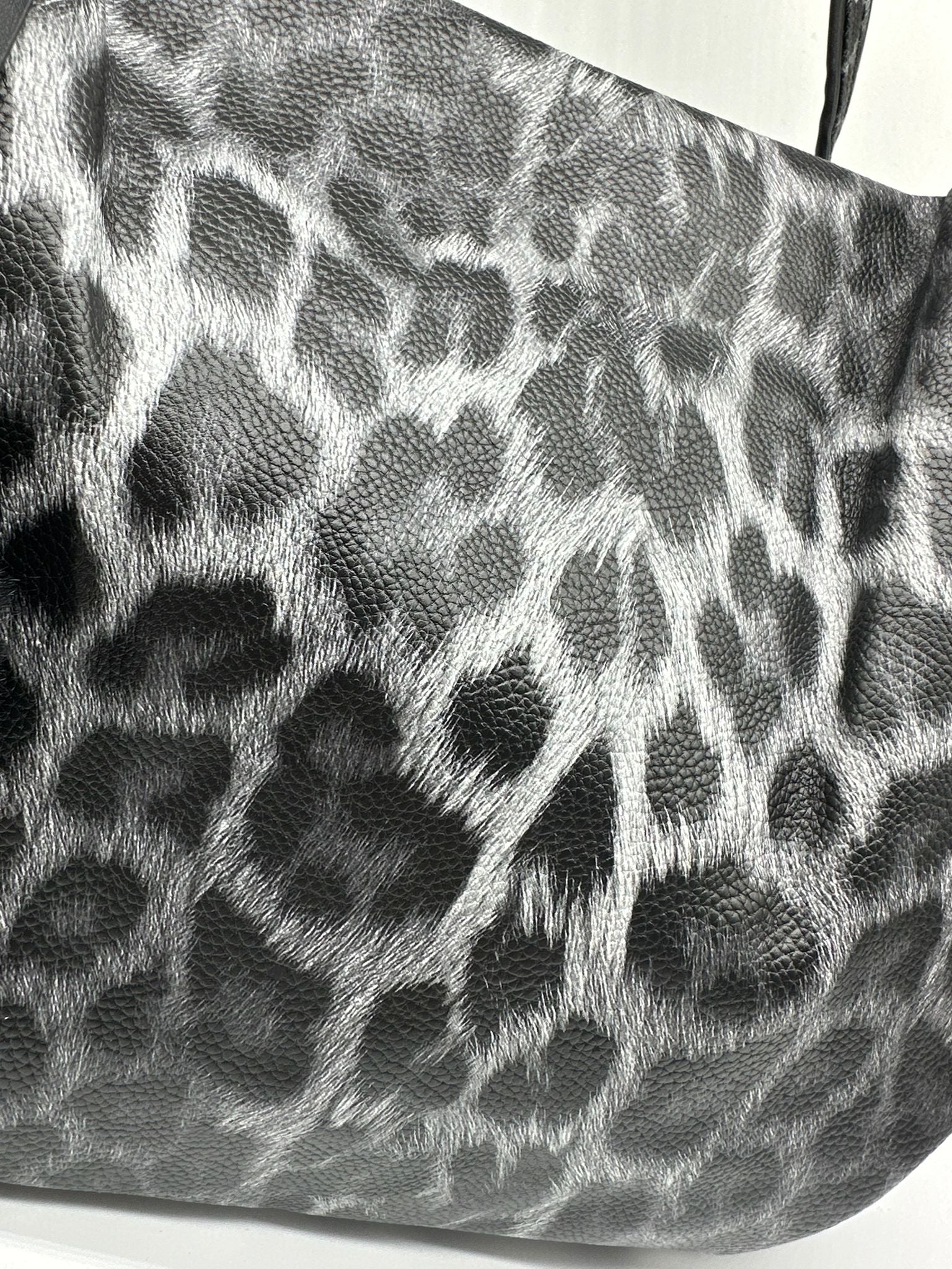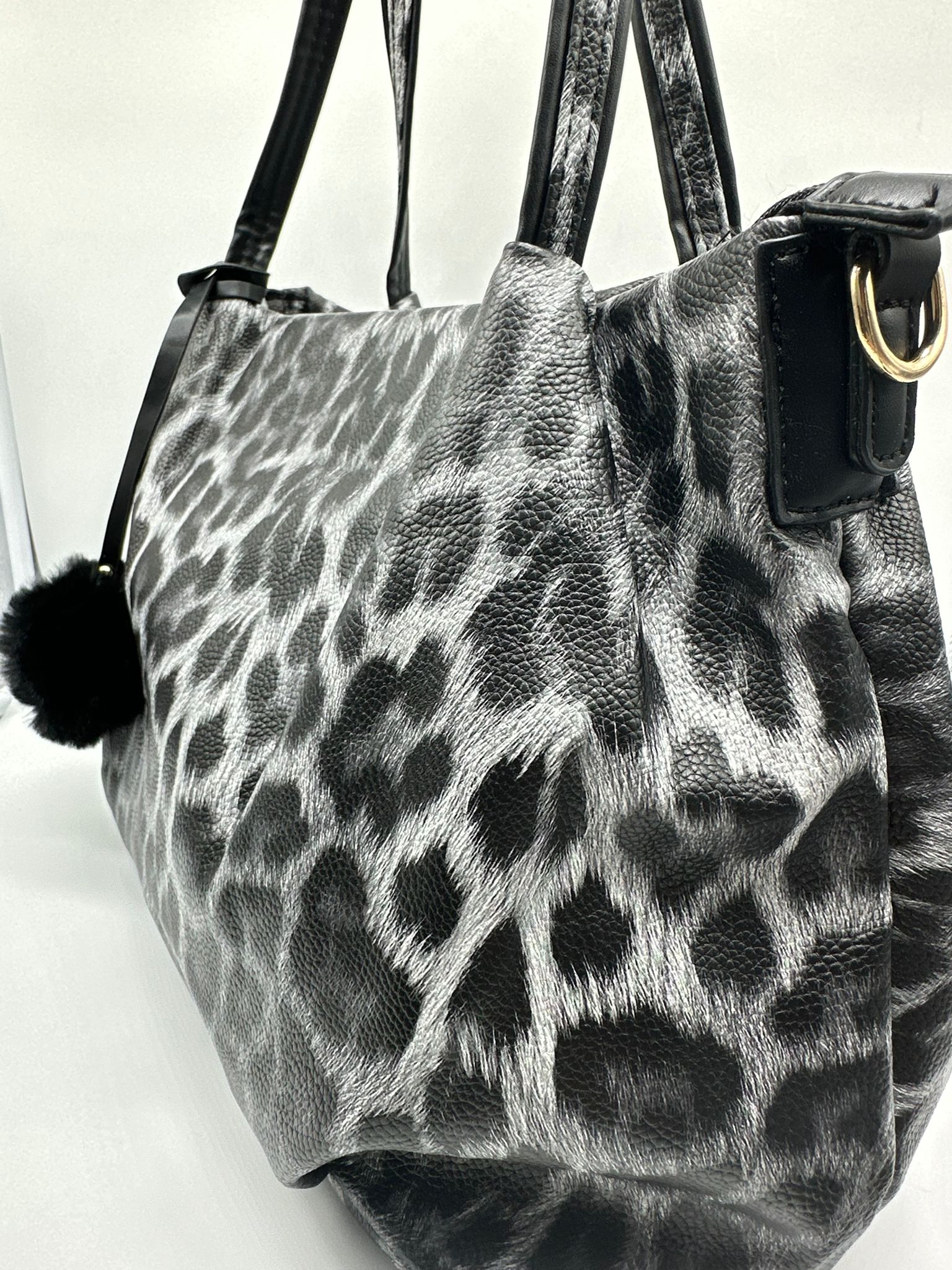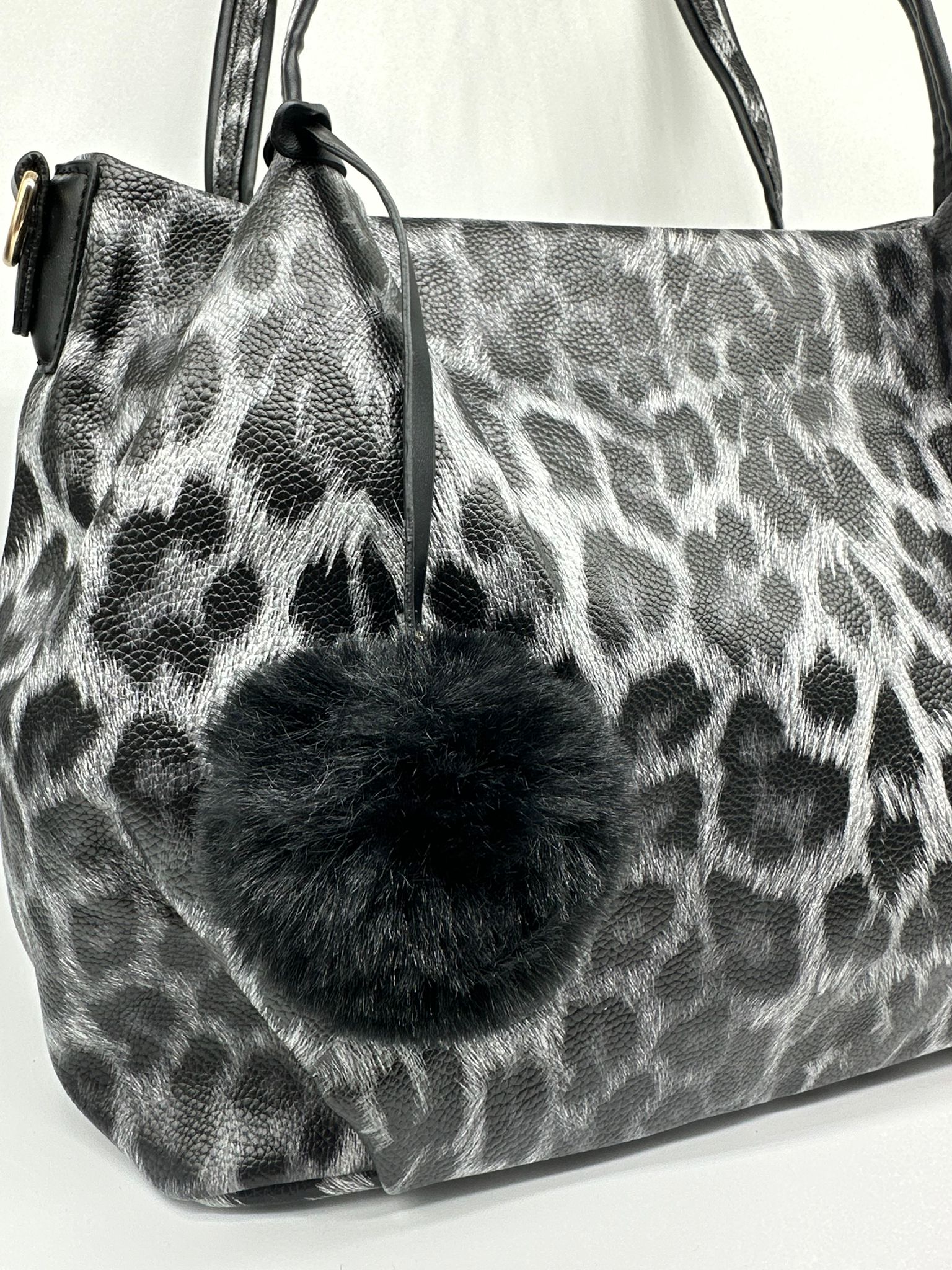 Elegante borsa shopper leopardata in tonalità grigio e nero, arricchita da un adorabile pon pon in pelliccia ecologica. Il design animalier glamour e la capienza generosa la rendono perfetta per ogni giorno.