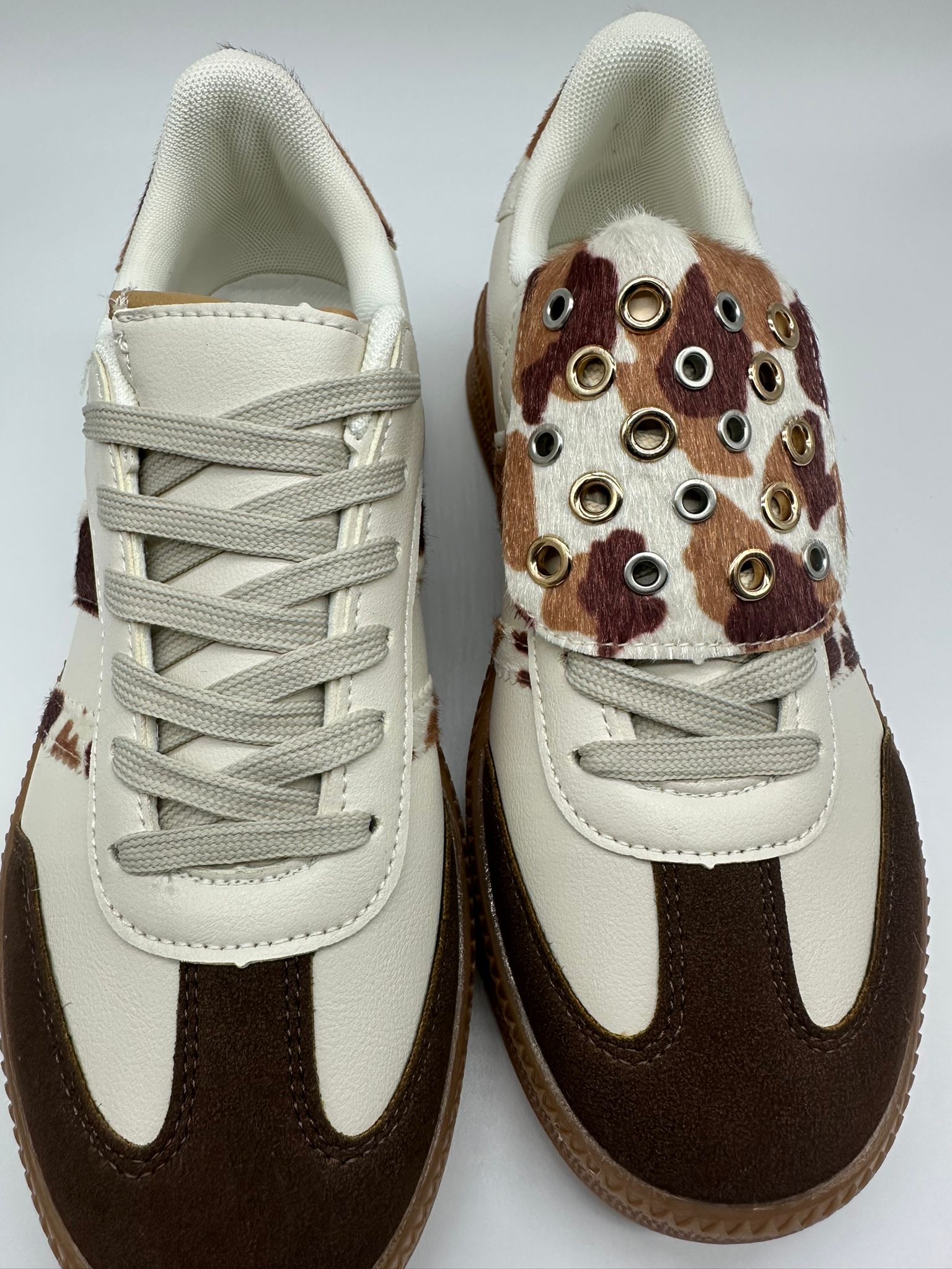 Le sneakers BROWN combinano stile urbano e comfort quotidiano. Realizzate con una base bianca in ecopelle e dettagli marroni in suede, queste scarpe sportive si distinguono per gli inserti animalier maculati che aggiungono un tocco di originalità. La suola in gomma garantisce stabilità e durata, mentre i dettagli con occhielli metallici completano il design moderno e versatile.