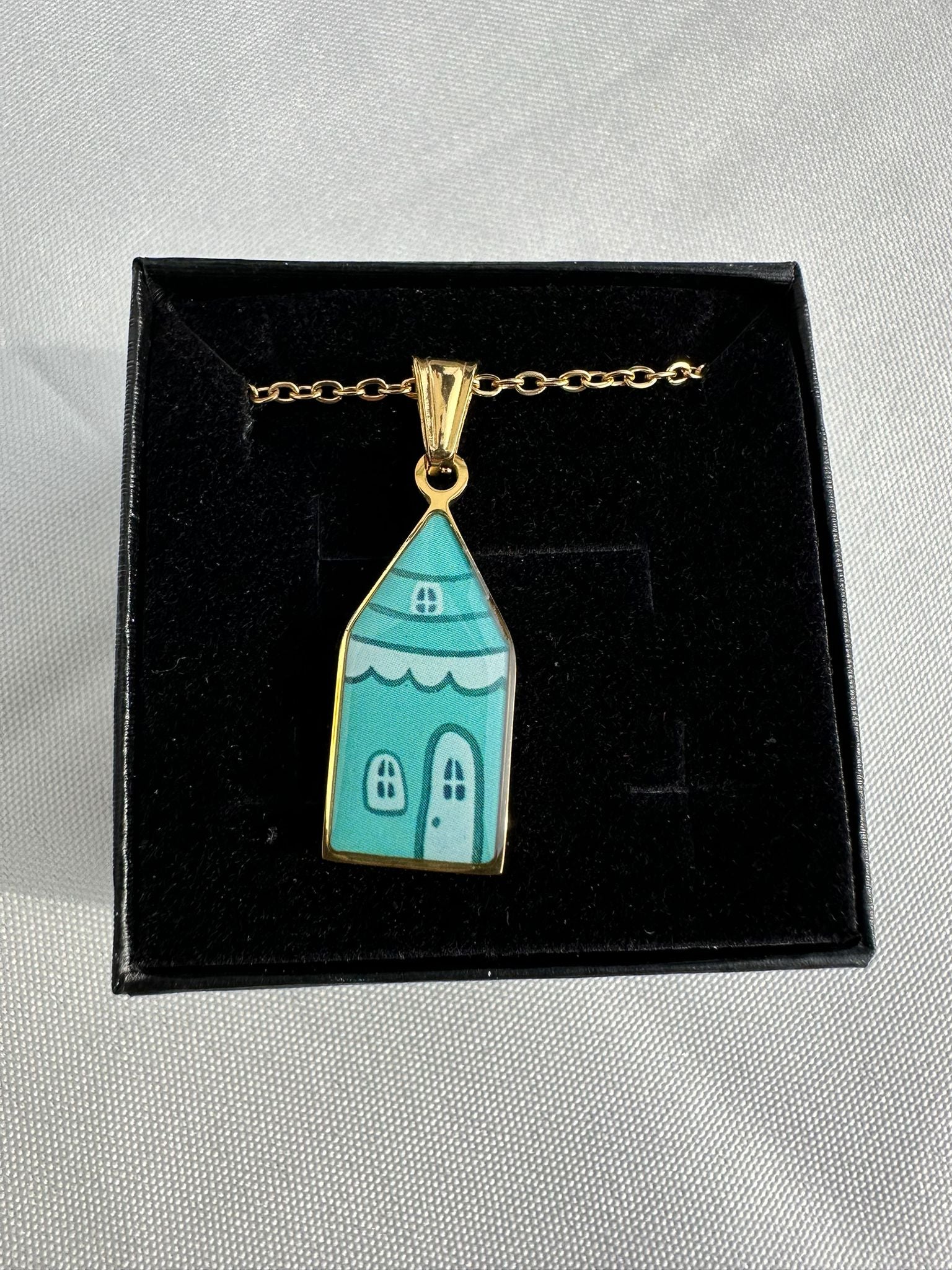 Collana con ciondolo a forma di casetta turchese in oro. Design unico e artigianale, perfetta come regalo o per completare il tuo look con un tocco di originalità.
