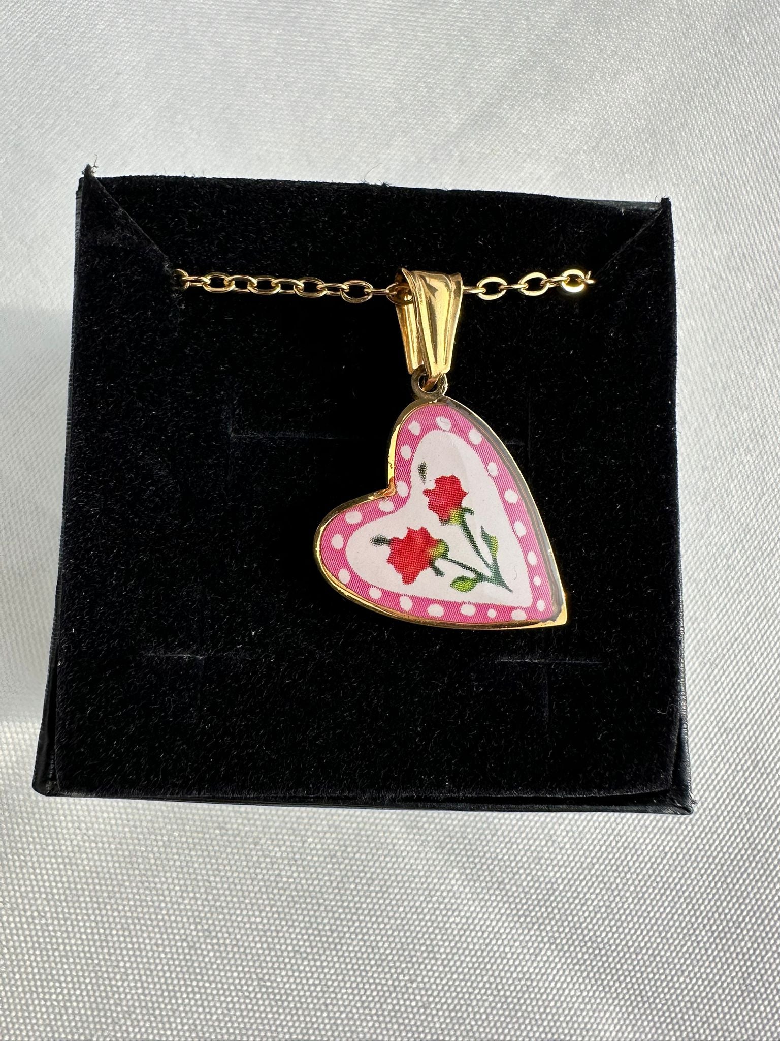 Collana con ciondolo a cuore decorato con rose rosse e bordo rosa a pois. Gioiello romantico in oro, ideale come regalo d'amore o per un look femminile e delicato.
