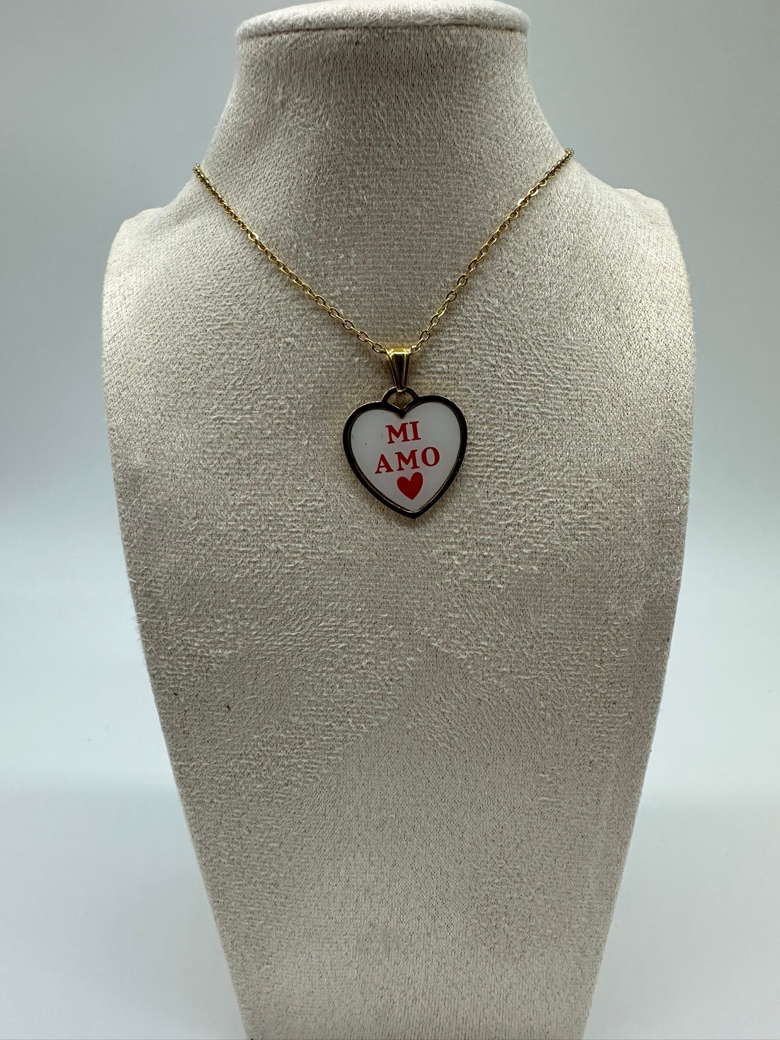 Collana romantica con ciondolo a cuore e scritta Mi Amo. Catena dorata delicata, messaggio di self-love. Perfetta da indossare o come regalo significativo.