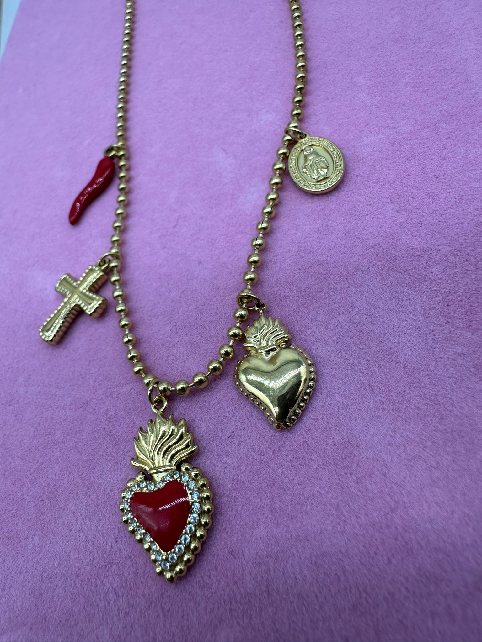 Questa collana non è solo un accessorio, ma un vero e proprio amuleto che unisce la spiritualità del cuore sacro, la protezione del corno rosso, la fede della croce e la devozione della medaglia. Un mix perfetto tra tradizione napoletana e stile moderno.