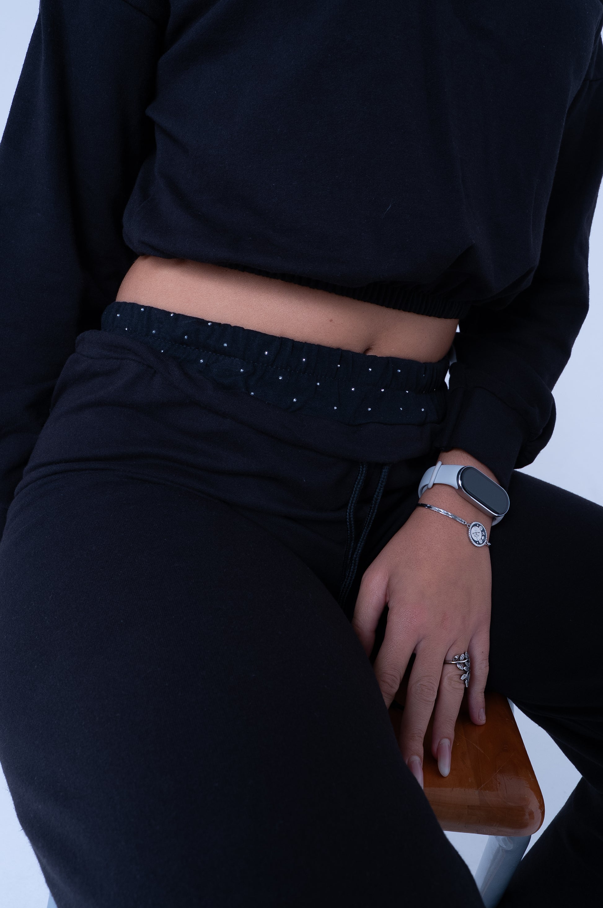 Coordinato elegante in nero composto da felpa crop e pantaloni con raffinati dettagli strass sulla fascia. Perfetto per un look casual-chic che non passa inosservato.