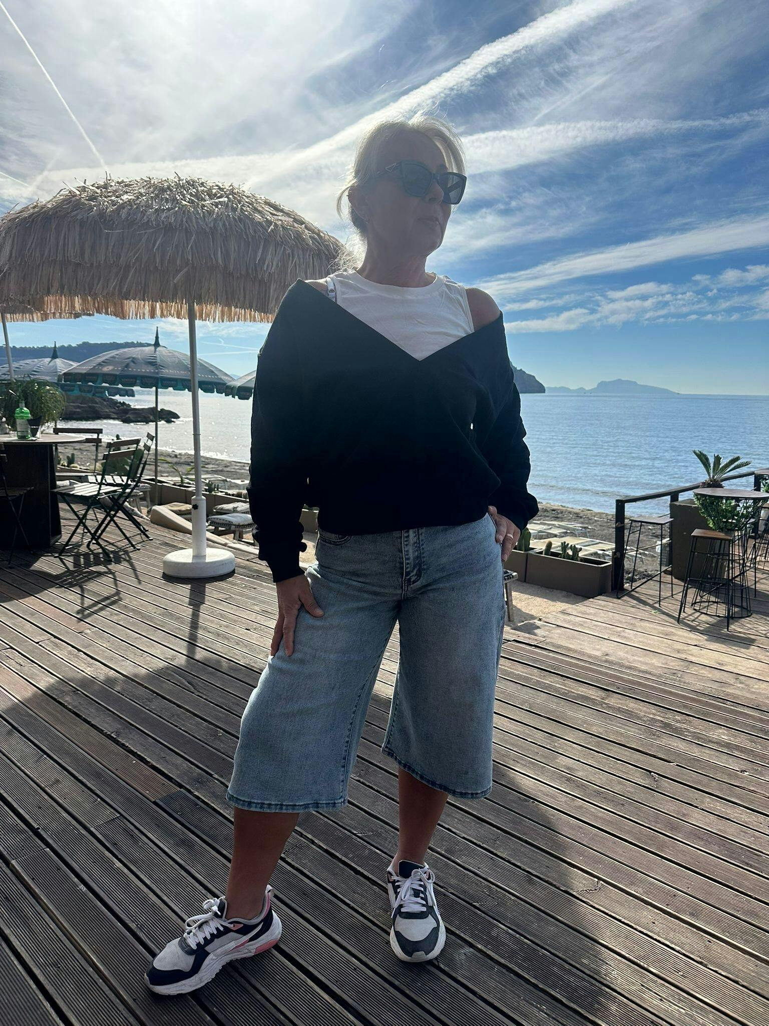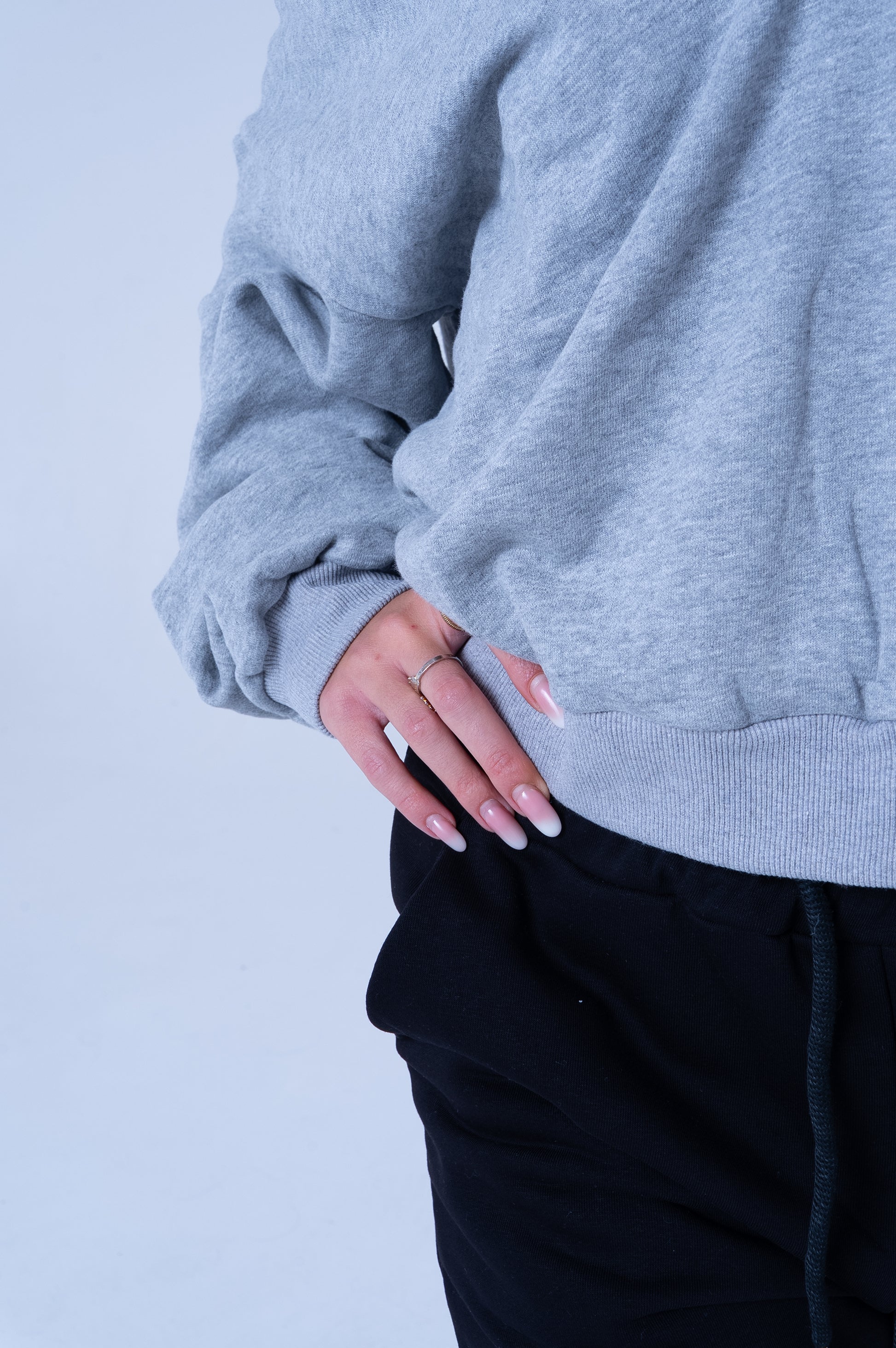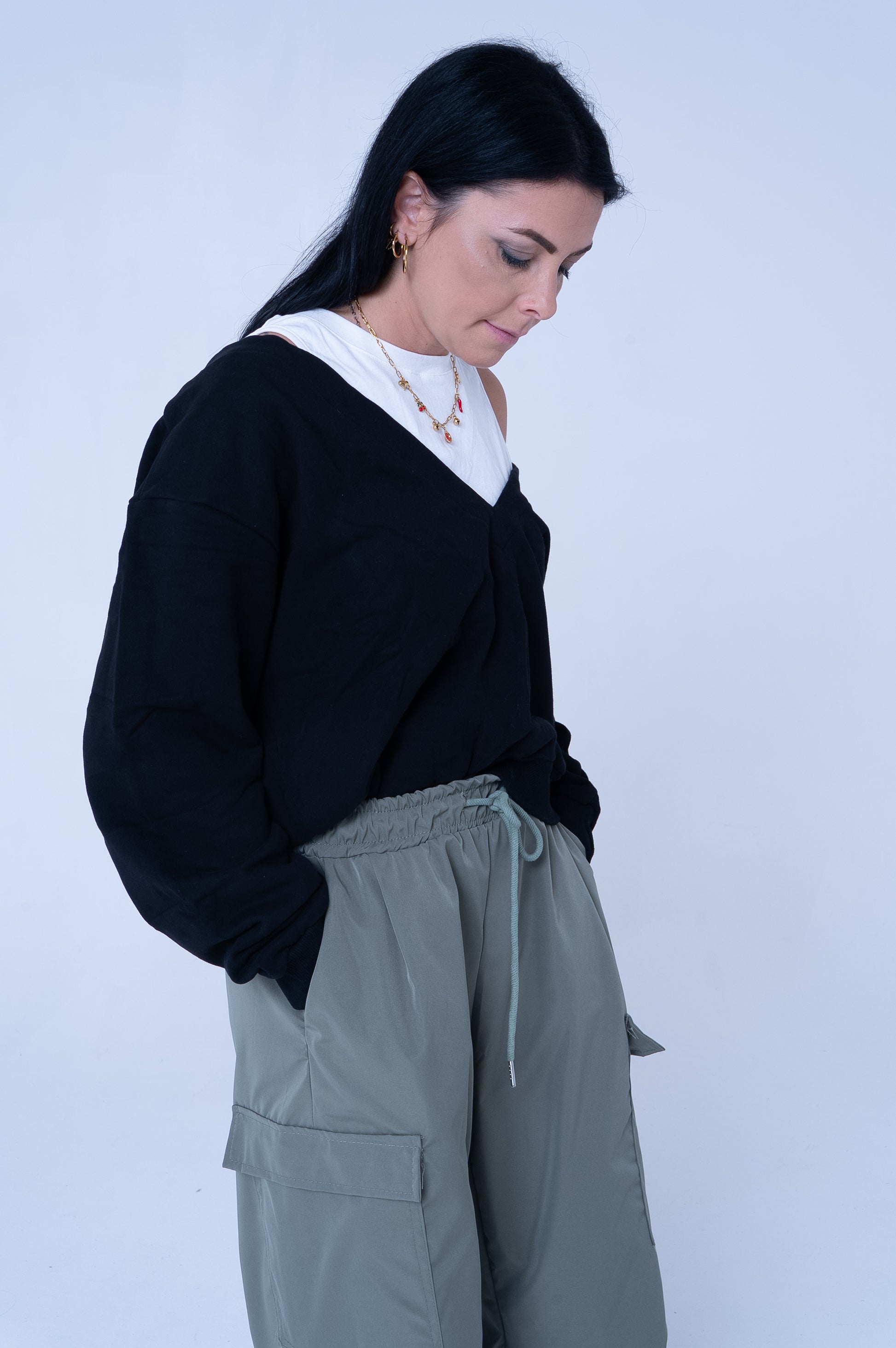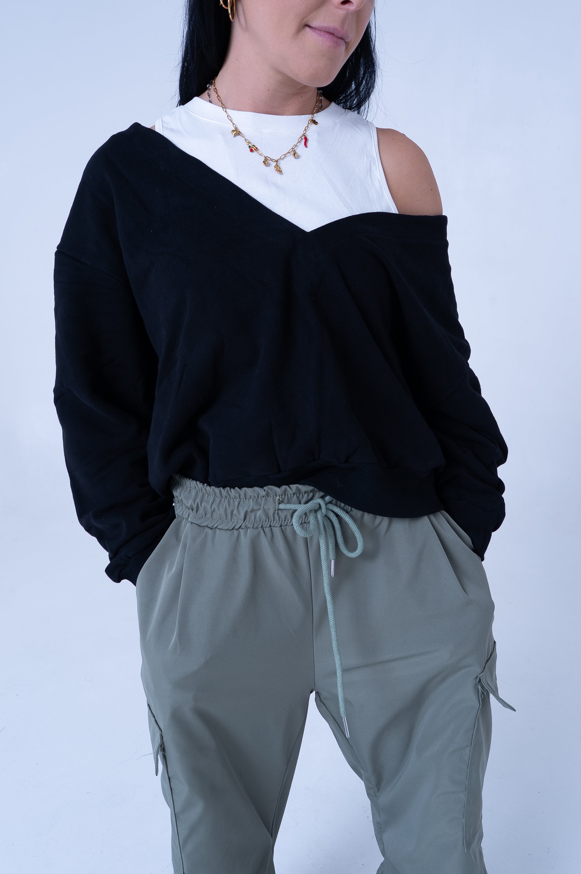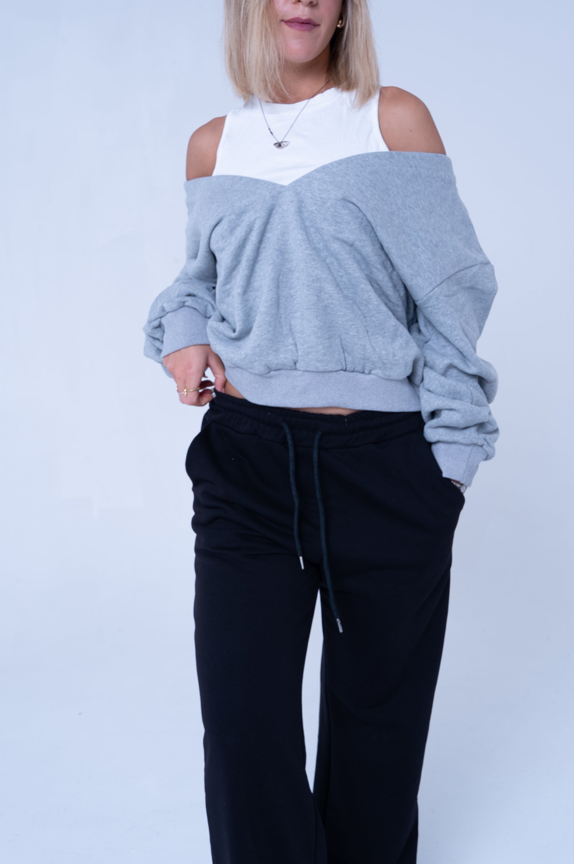 Felpa dal design unico con effetto layered che simula un top bianco sotto una felpa off-shoulder. Un capo intero che crea l'illusione di due pezzi sovrapposti!