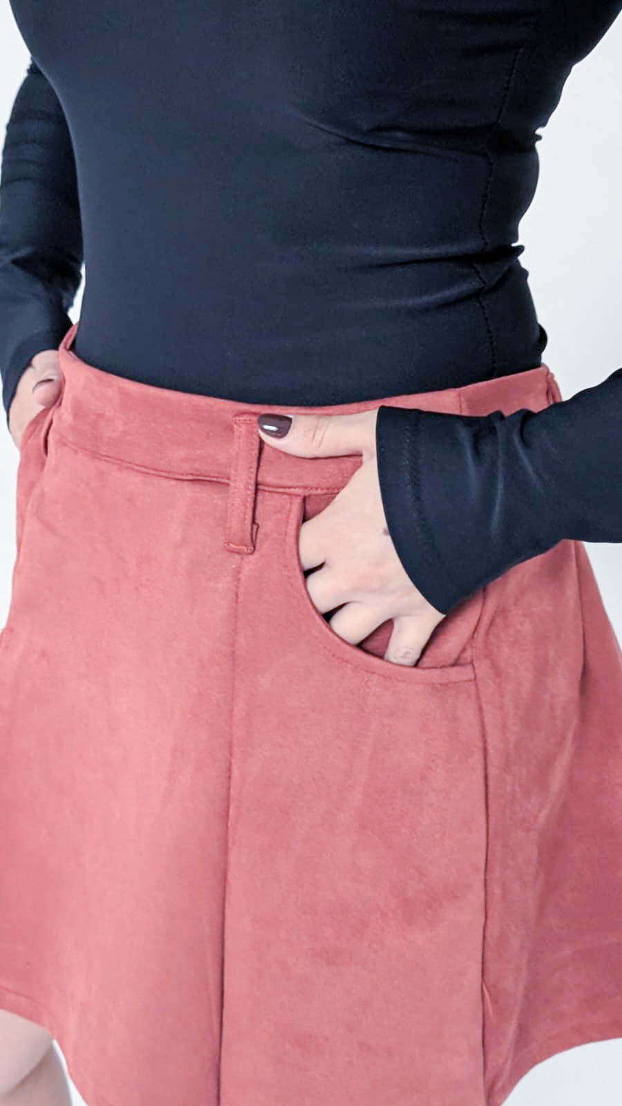 Gonna in camoscio morbido e setoso al tatto. Vestibilitá morbida, Taglia S, M, L. Gonna in colore ''Mattone'' e ''Cioccolato''.