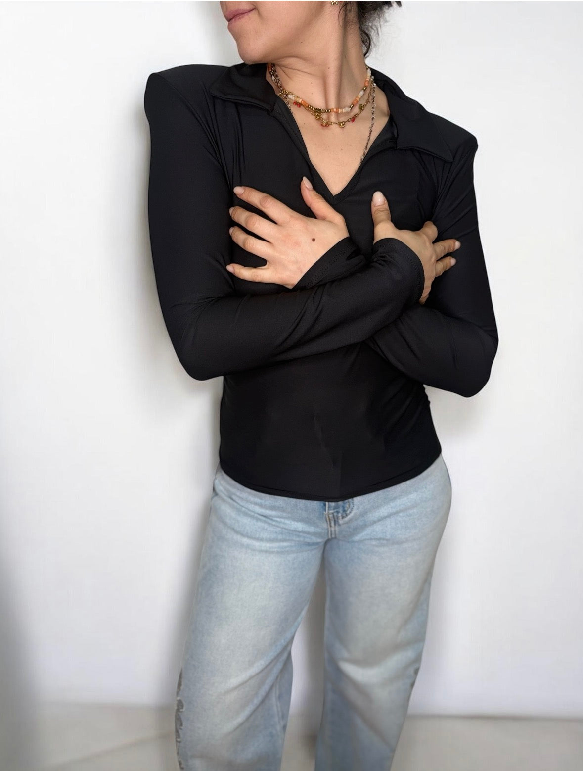 Maglietta donna elegante con colletto polo e tessuto semi-trasparente. Maniche lunghe per uno stile sofisticato e versatile, perfetta da abbinare a jeans o gonne. Disponibile in nero e marrone cioccolato. Capo essenziale per look casual-chic di qualità premium. Ideale per ogni occasione.