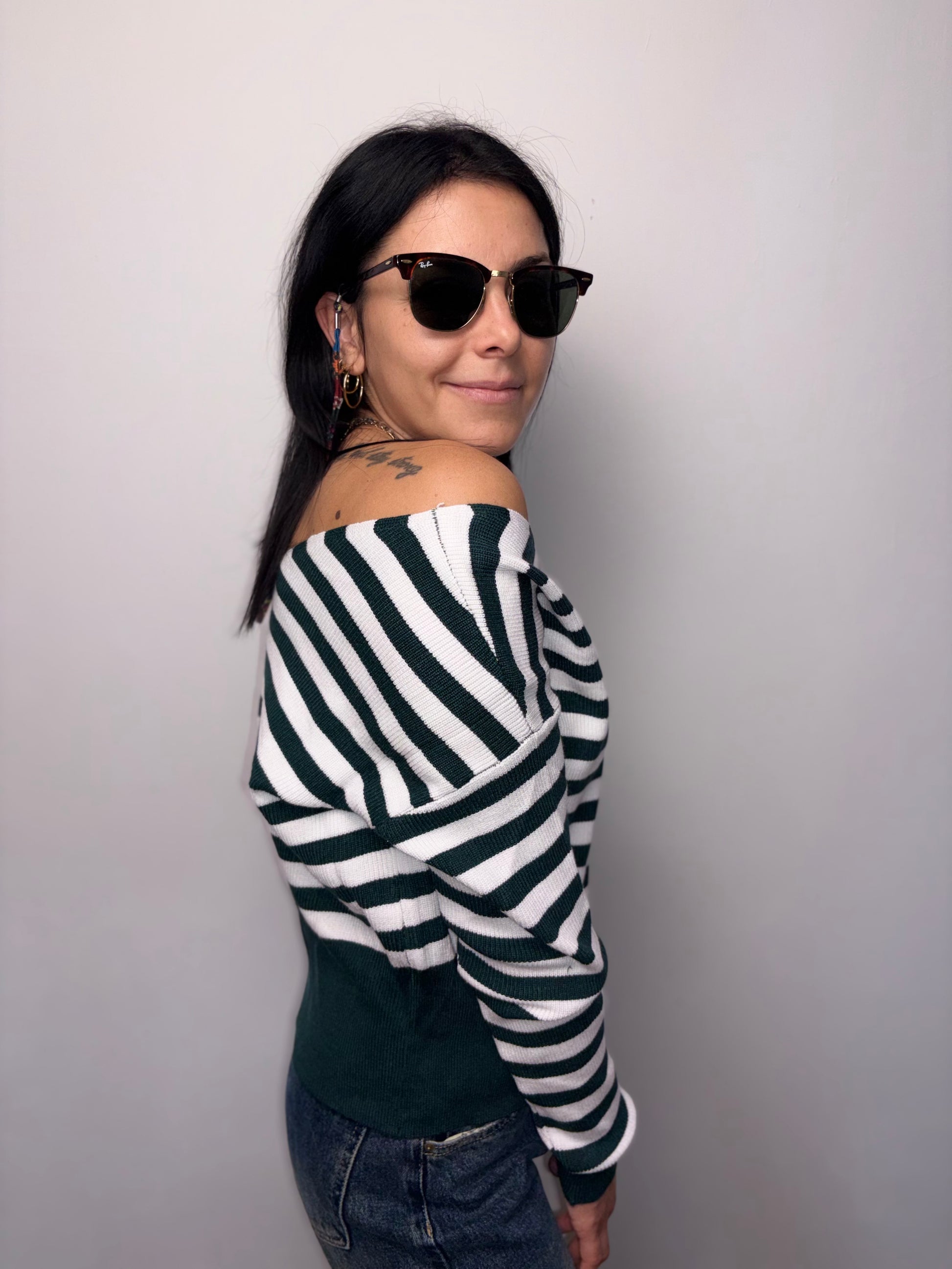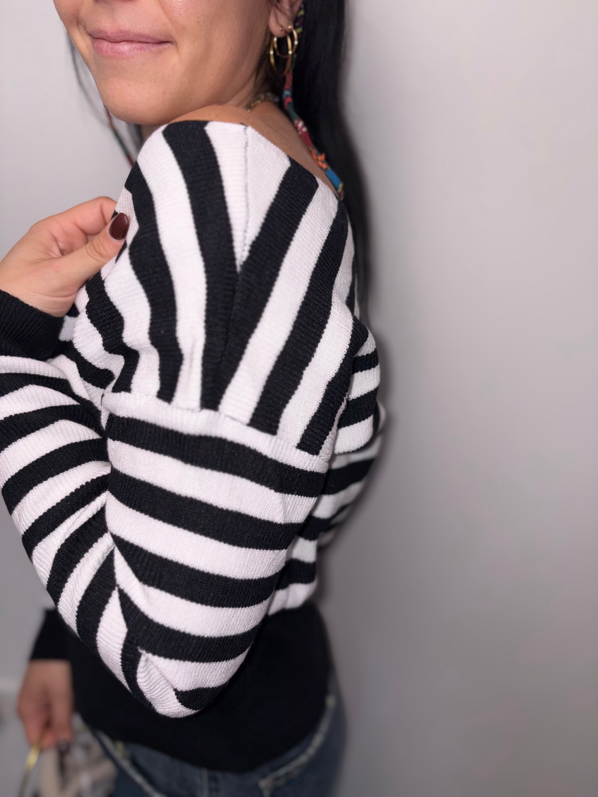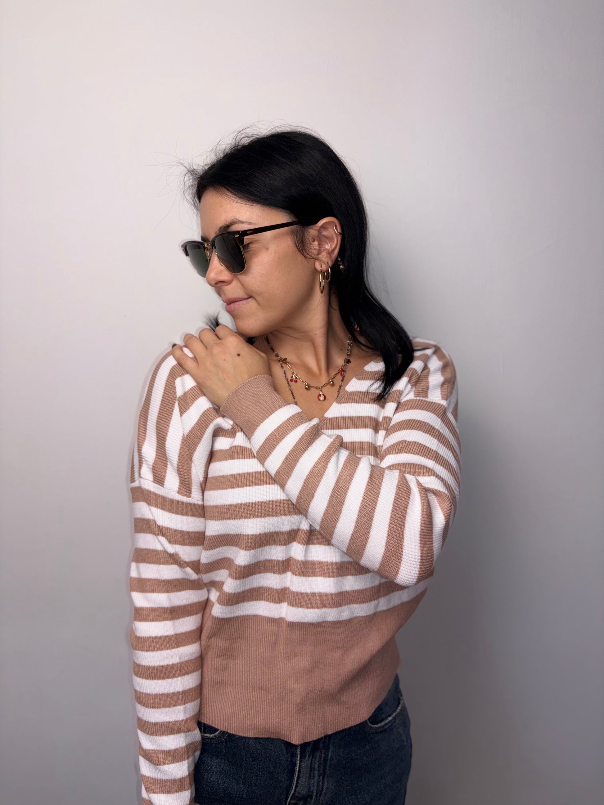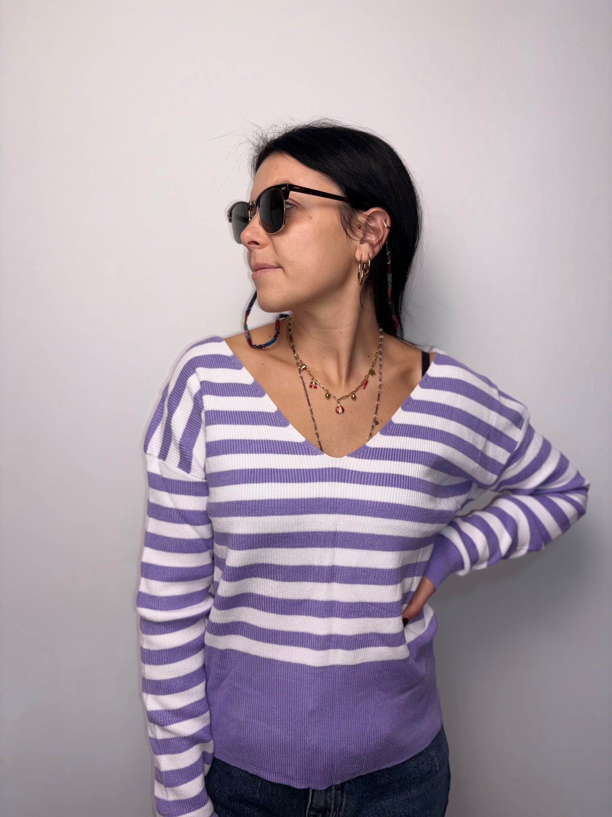Maglione morbido e versatile con eleganti righe orizzontali bianche e scollo a V. Perfetto per un look casual-chic, si abbina facilmente a jeans e accessori. Disponibile in varie colorazioni.