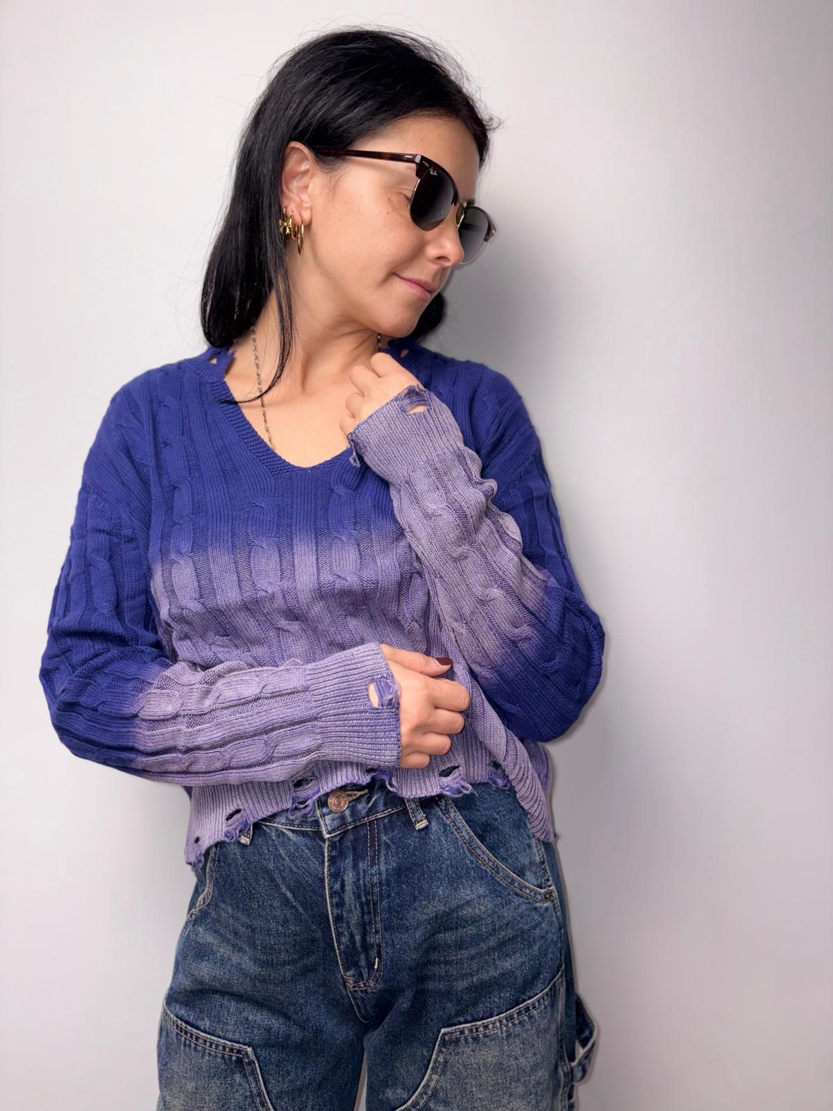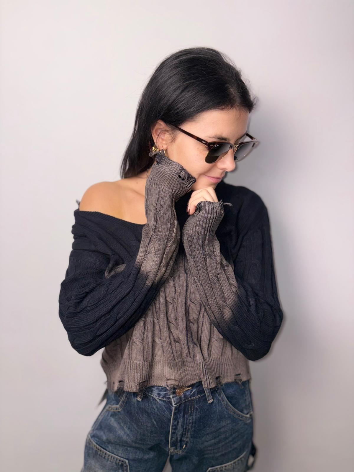 "Scopri il nostro maglione a trecce con effetto degradé sfumato, perfetto per un look casual e trendy. Design distressed con bordi sfilacciati, disponibile in diverse tonalità. Morbido, confortevole e versatile, ideale per outfit quotidiani dallo stile unico. Maglione corto da donna con lavorazione a trecce e finish vintage."