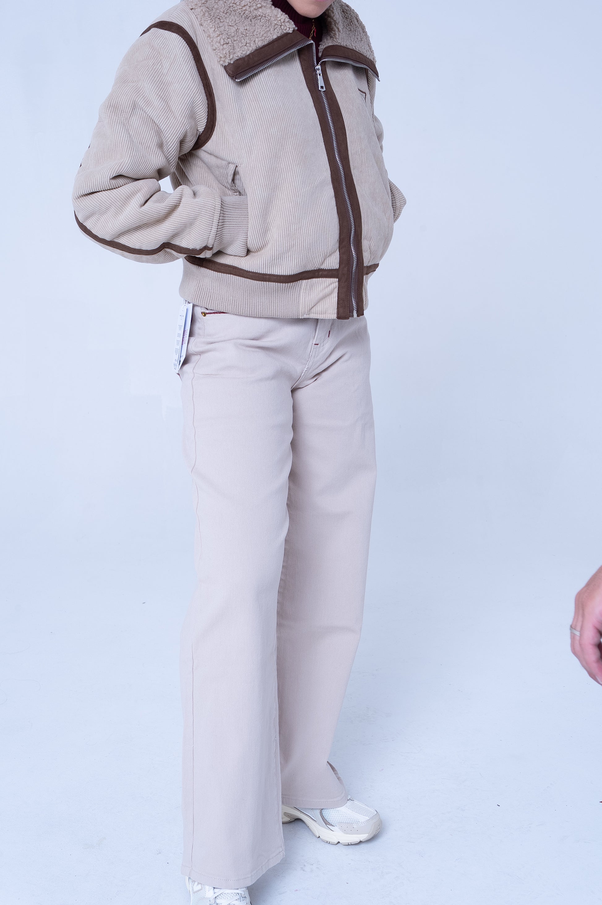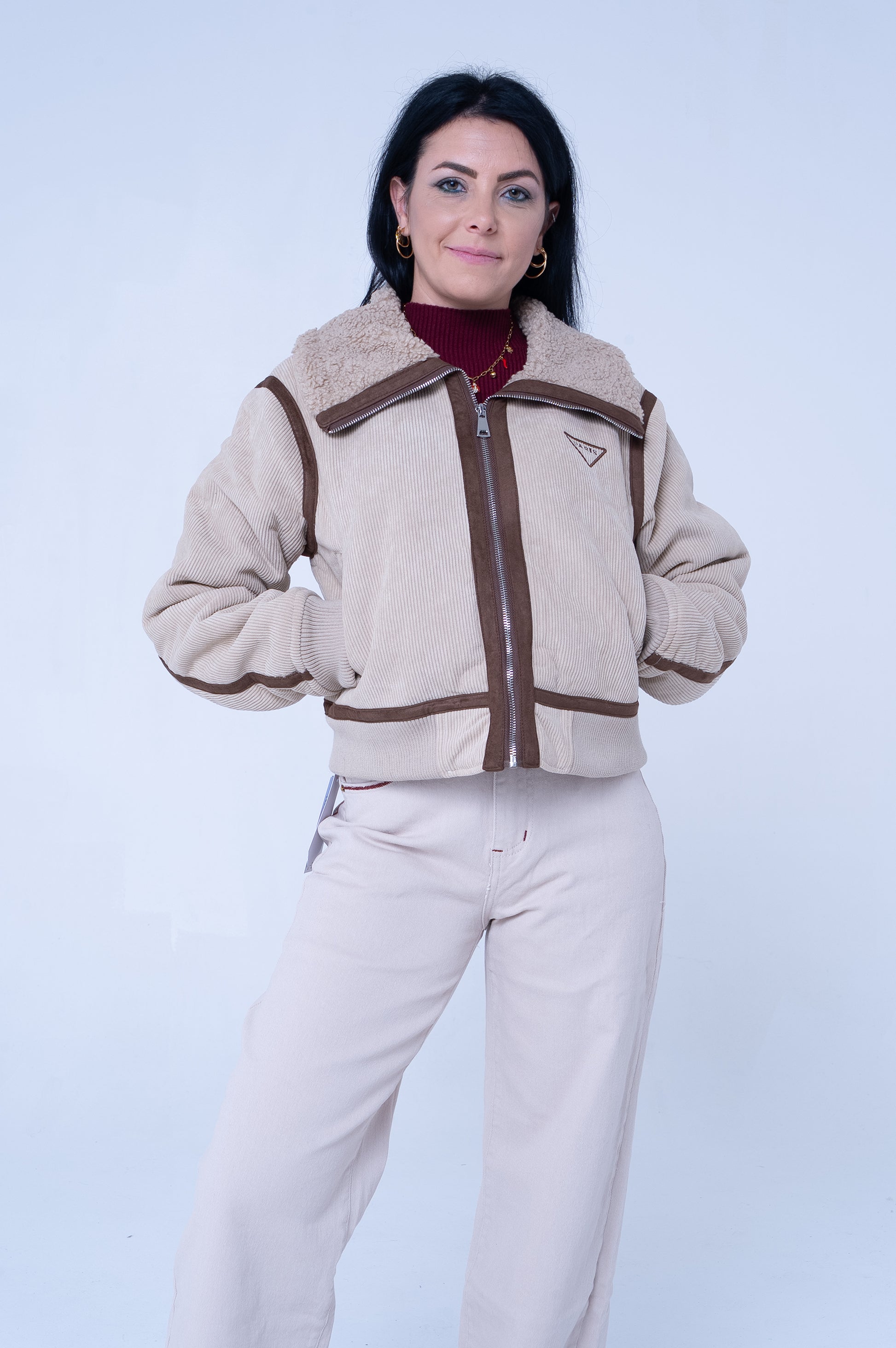 Montone corto beige in morbido tessuto a coste con design sportivo e moderno. Caratterizzato da eleganti bande marroni a contrasto che percorrono le maniche e delineano la silhouette, creando un effetto visivo dinamico. La zip frontale centrale con cursore in metallo assicura chiusura pratica, mentre la vestibilità cropped si abbina perfettamente a pantaloni e jeans a vita alta. Polsini e orlo elasticizzati per una vestibilità confortevole. Il colletto alto offre protezione e stile. Tasche laterali funzionali completano il design. Perfetto per la mezza stagione, questo montone in stile athleisure è versatile e trendy, ideale per outfit casual quotidiani che richiedono comfort senza rinunciare all'eleganza. Taglia unica con vestibilitá da una XS ad una L.