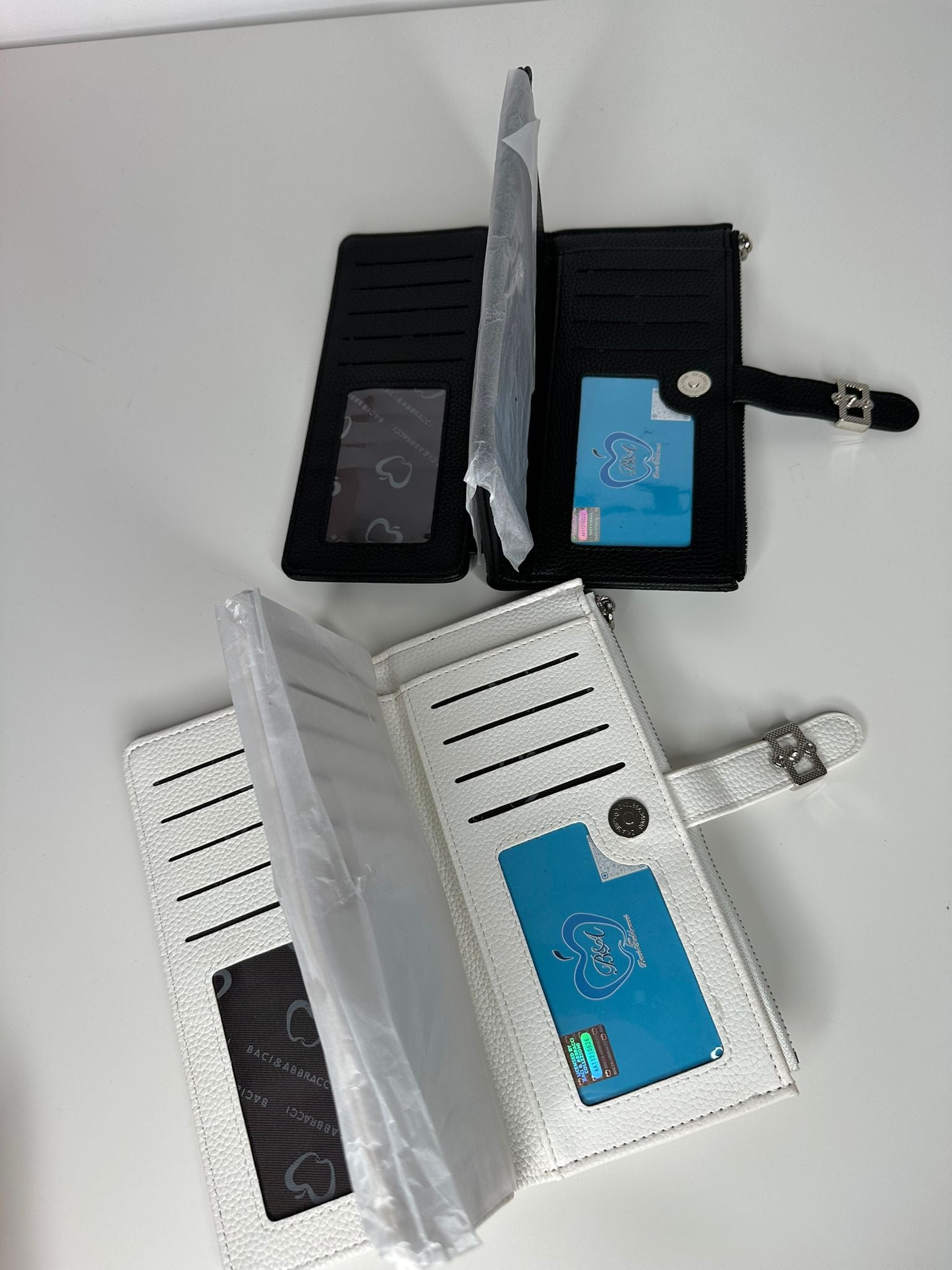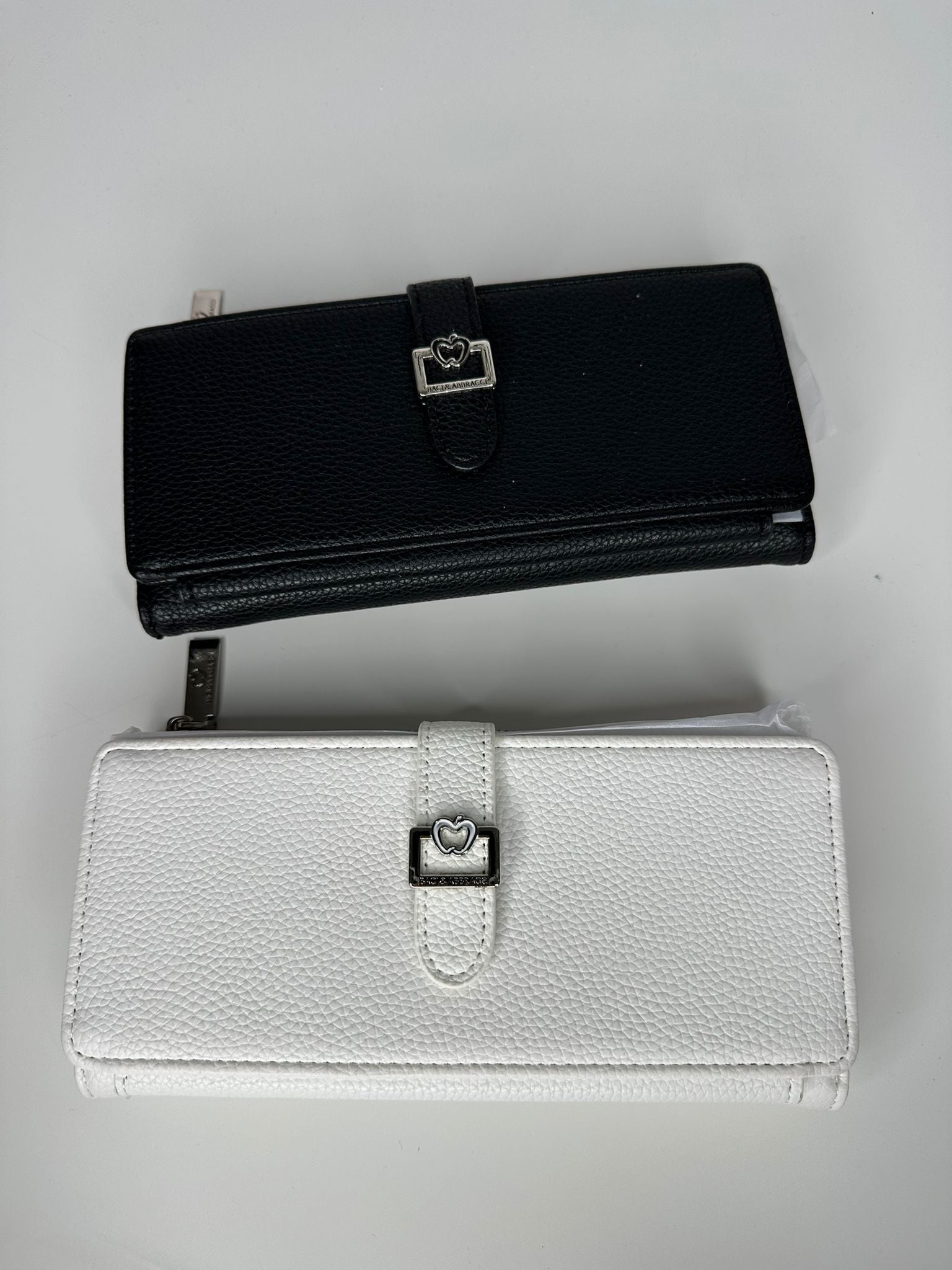 Portafoglio donna elegante in pelle sintetica con chiusura a clip e logo cuore. Multipli scomparti per carte e banconote. Disponibile in nero e bianco.