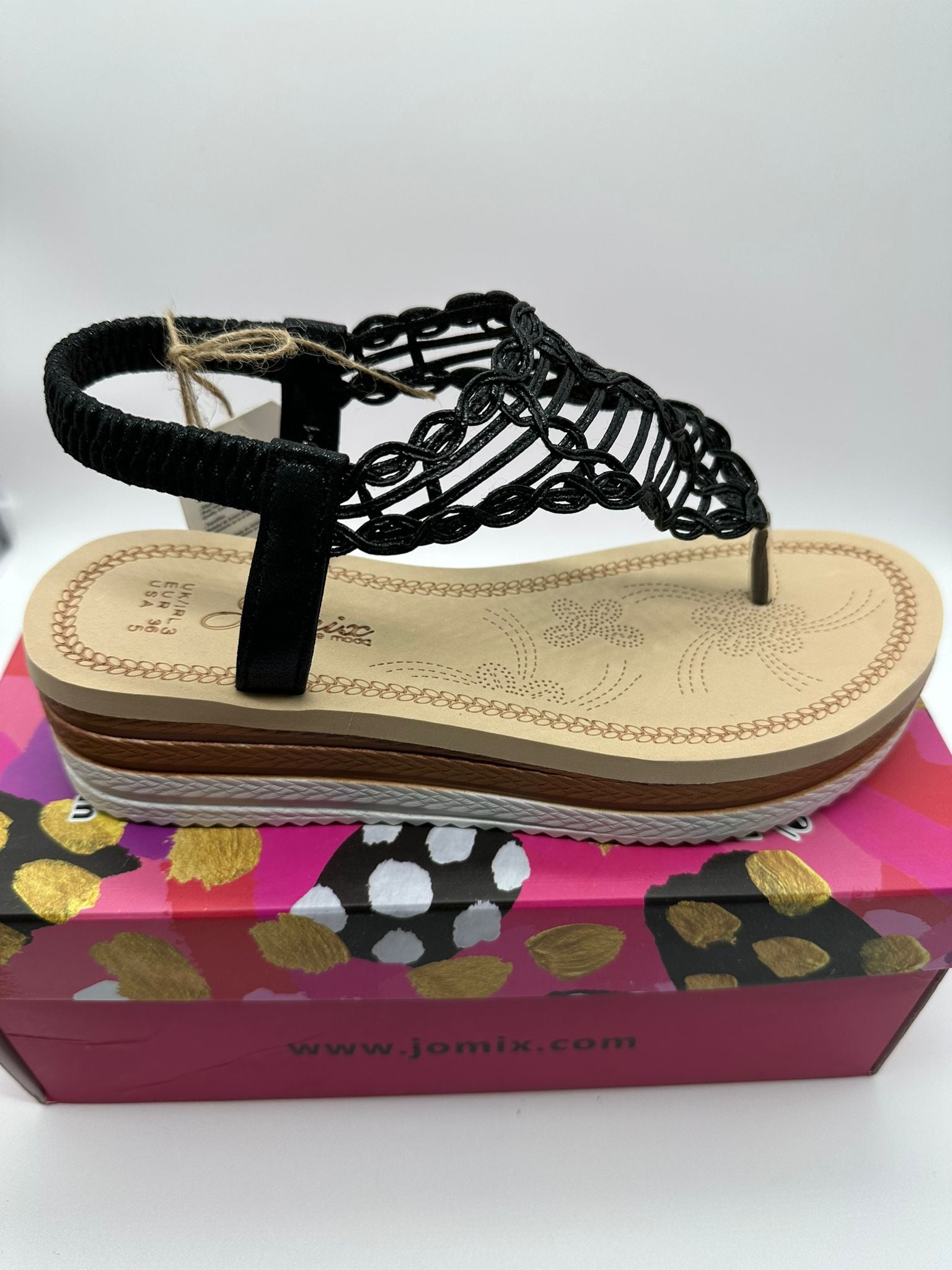 Sandali infradito eleganti con intreccio geometrico nero e suola platform. Design sofisticato con cinturino alla caviglia regolabile. Comfort e stile estivo.