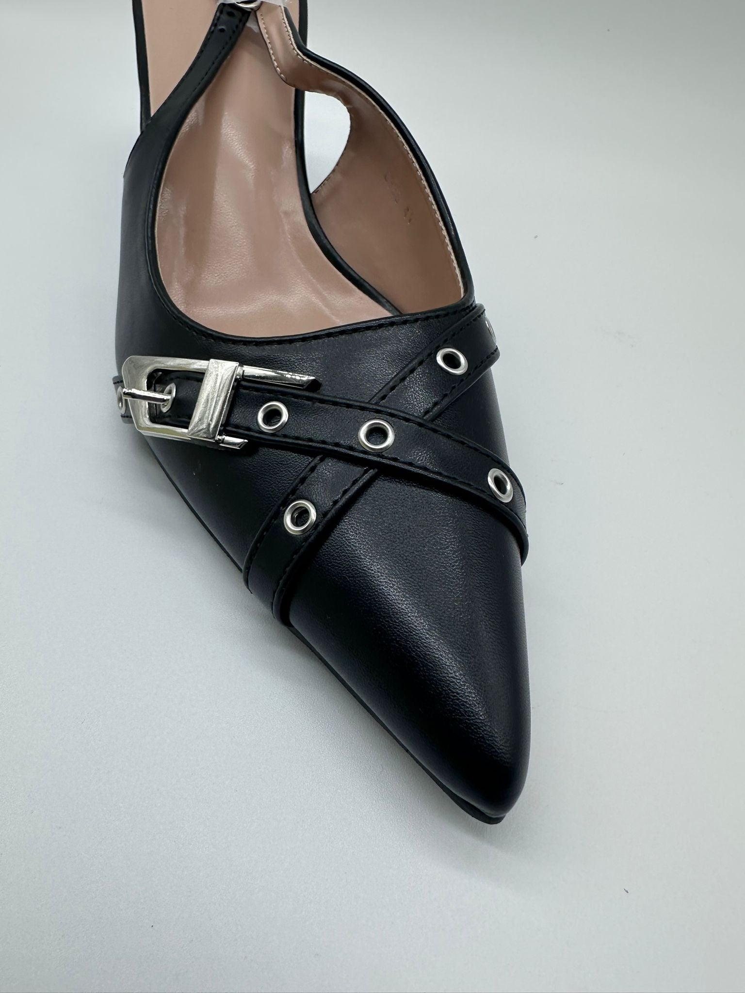 Slingback nera in ecopelle morbida con design a punta affusolata e tacco a spillo laccato. Il dettaglio distintivo è la doppia fascia incrociata con occhielli metallici argentati e fibbia squadrata, per un look edgy e sofisticato. Cinturino posteriore regolabile per una vestibilità sicura. Perfetta per outfit da sera o look urban-chic. Disponibile in diverse taglie.