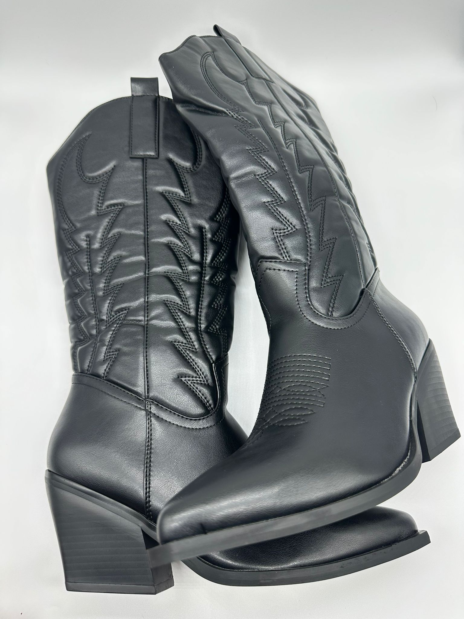 Gli stivali texani neri sono un must-have per chi ama lo stile western-chic. Realizzati in ecopelle nera di alta qualità, questi stivali si distinguono per gli eleganti ricami decorativi sulla tomaia che richiamano la tradizione cowboy con un tocco contemporaneo.