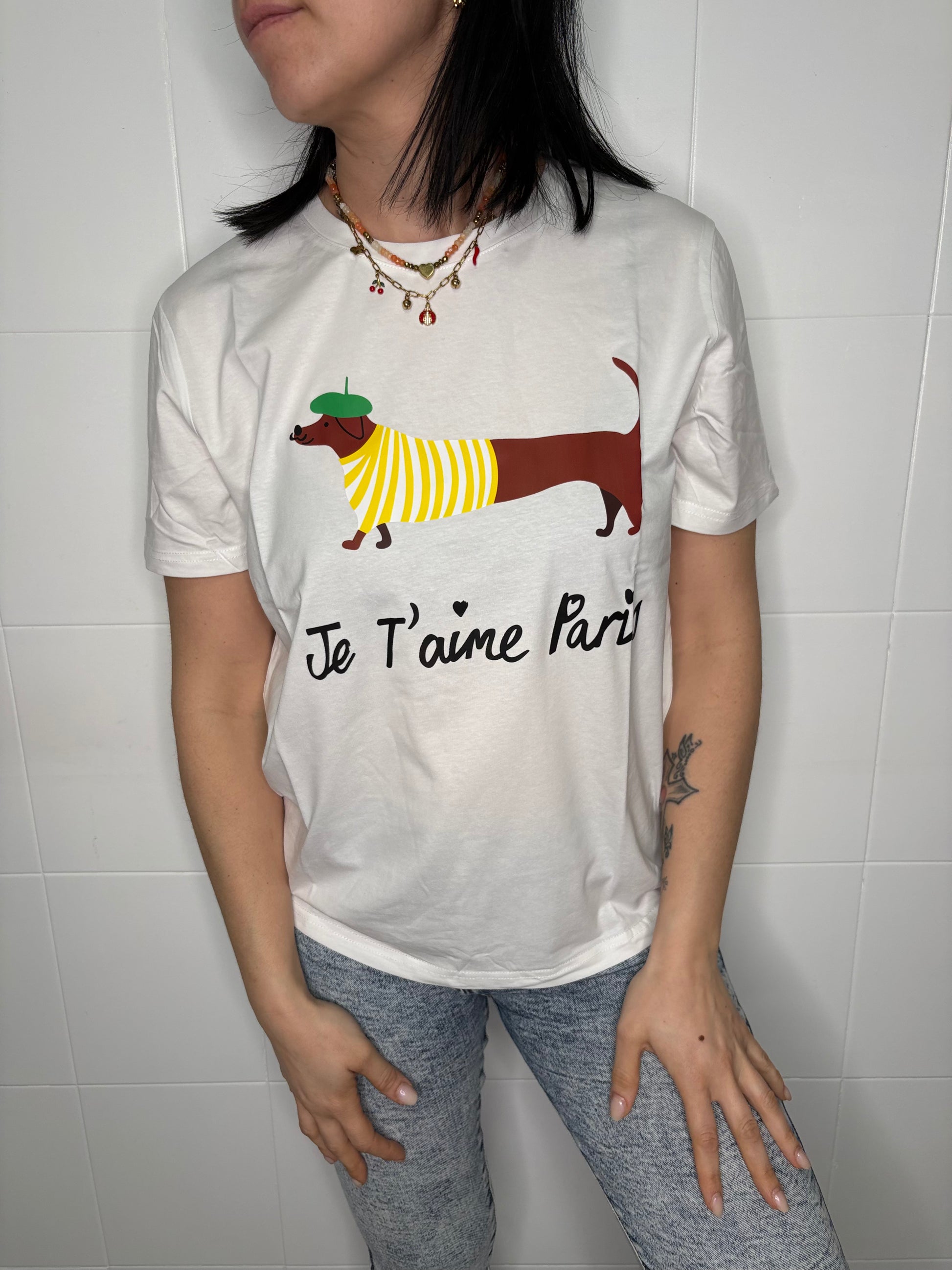 T-shirt donna Je T'aime Paris con bassotto parigino, cotone 100%. Taglia unica XS-XL. Design divertente e romantico per chi ama Parigi e lo stile francese.