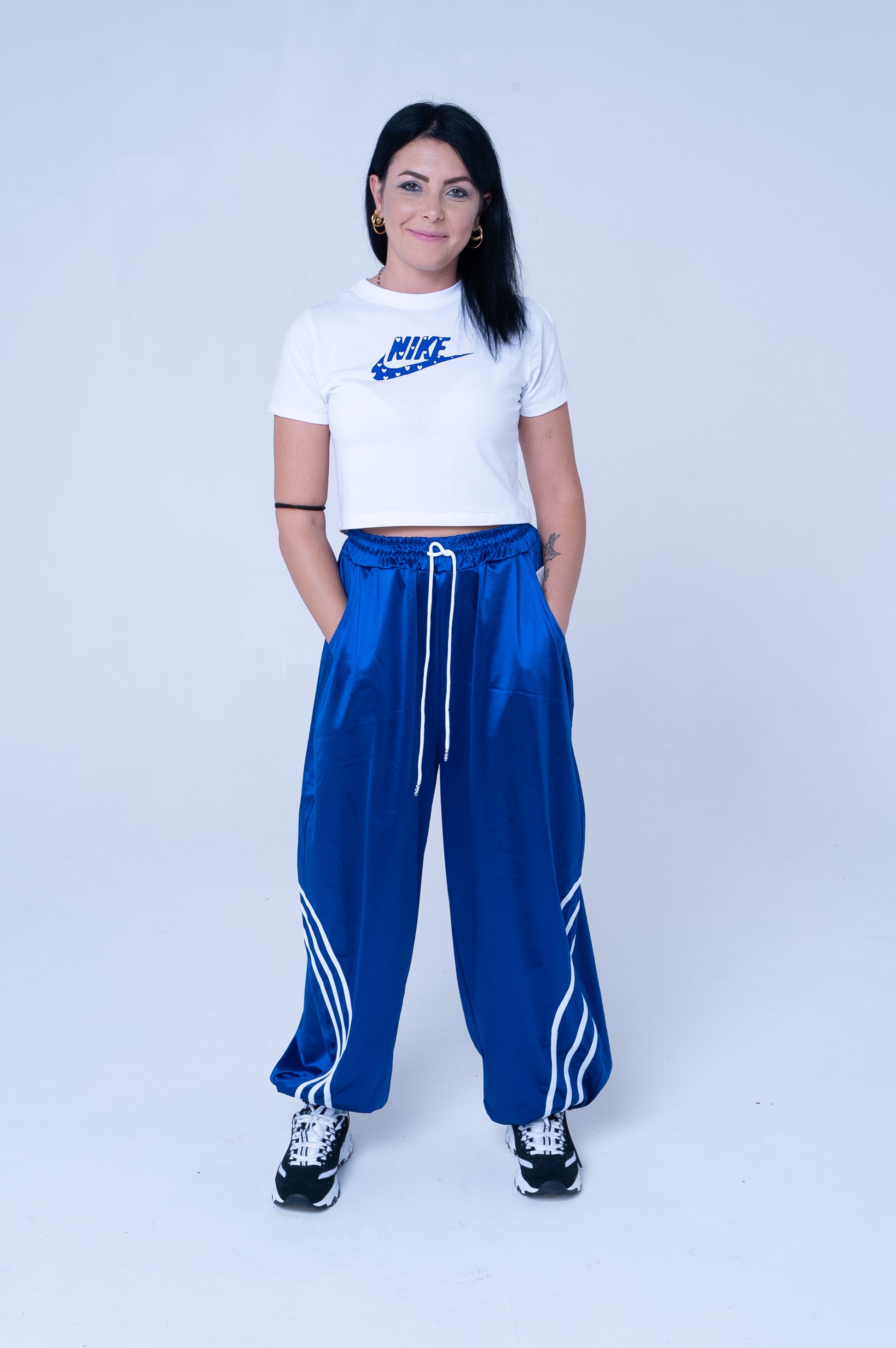 Esclusiva t-shirt Nike rivisitata con logo blu decorato da piccoli cuori bianchi. Una creazione unica DR-CLYDE SHOP che unisce il classico stile Nike a un tocco romantico e originale.