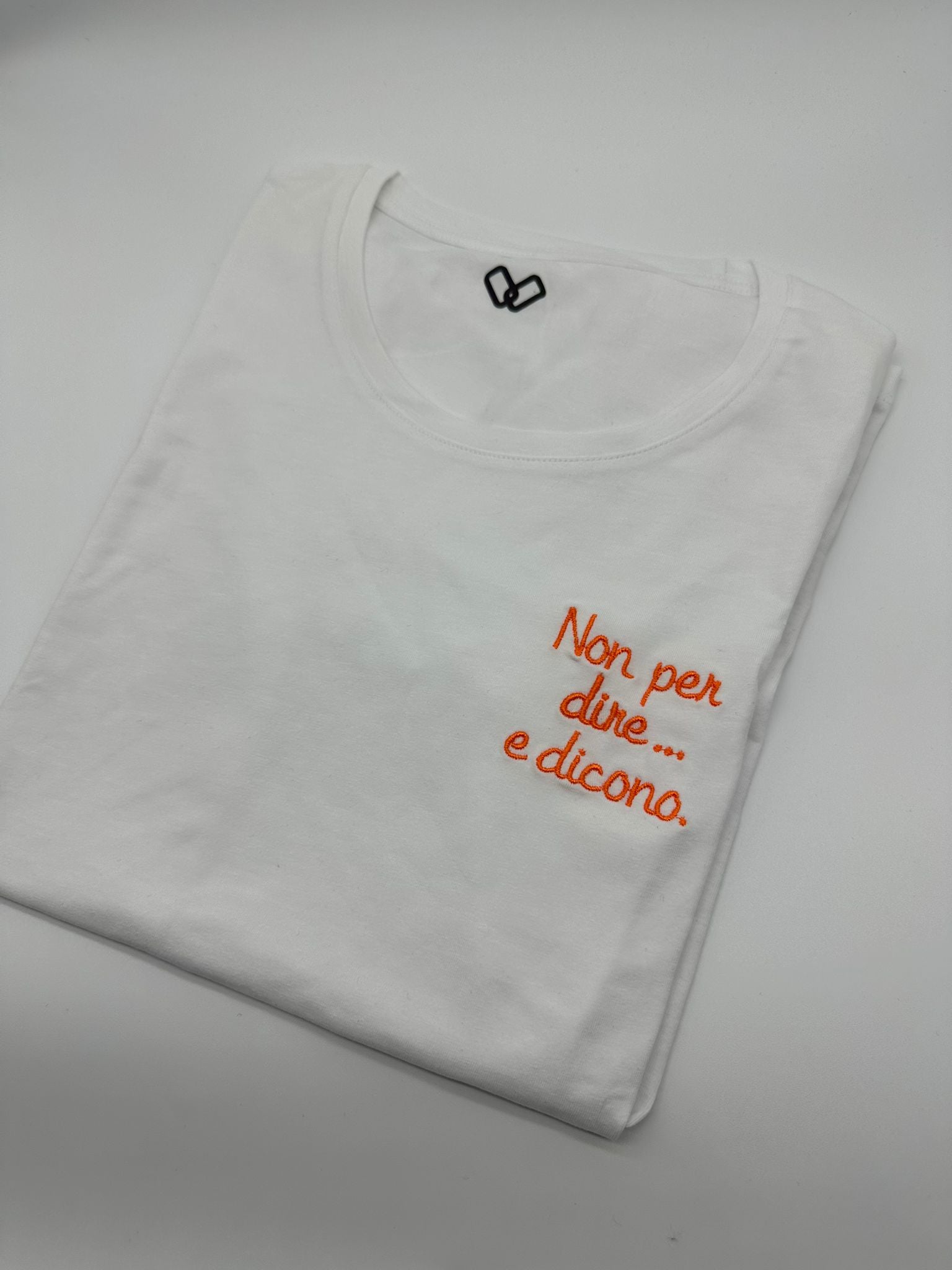 ''Scopri la nostra T-Shirt ricamata 'Non per dire e dicono' - Edizione Italiana. Unica nel suo genere, con ricamo di colore arancione su fondo bianco. Taglia unica con vestibilità da XS a L.''