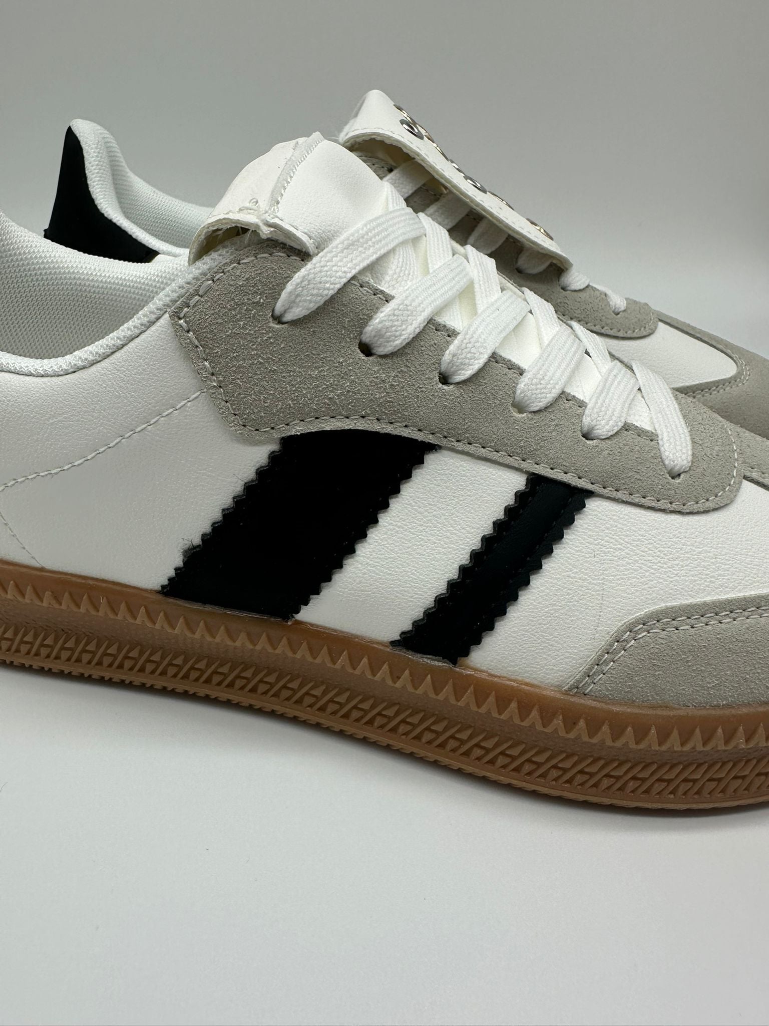 Le sneakers WHITE sono la scelta perfetta per chi cerca uno stile sportivo e contemporaneo. Caratterizzate da una base bianca in ecopelle con inserti grigi in suede, queste scarpe si distinguono per le iconiche strisce laterali nere che donano un look dinamico e riconoscibile.