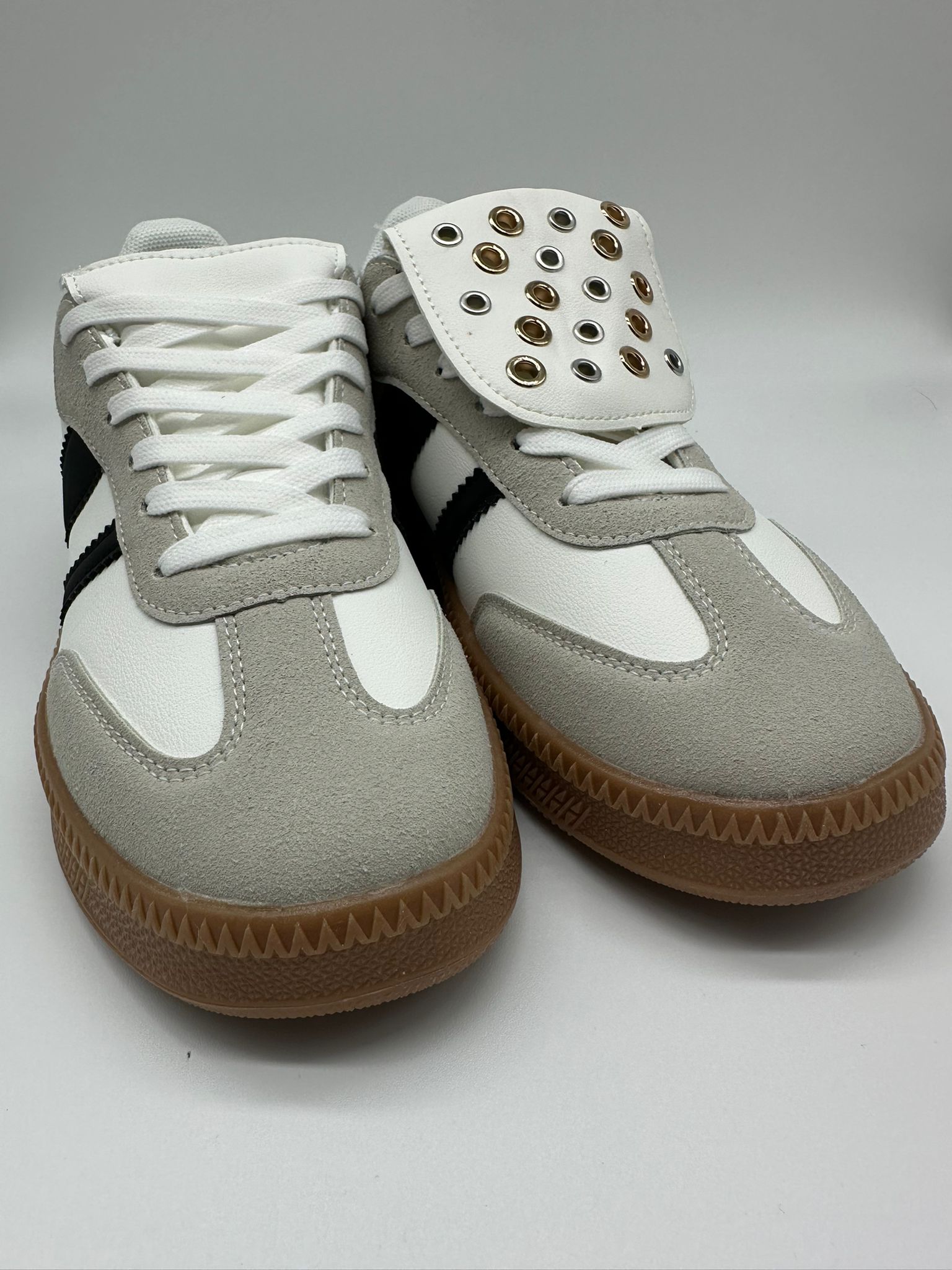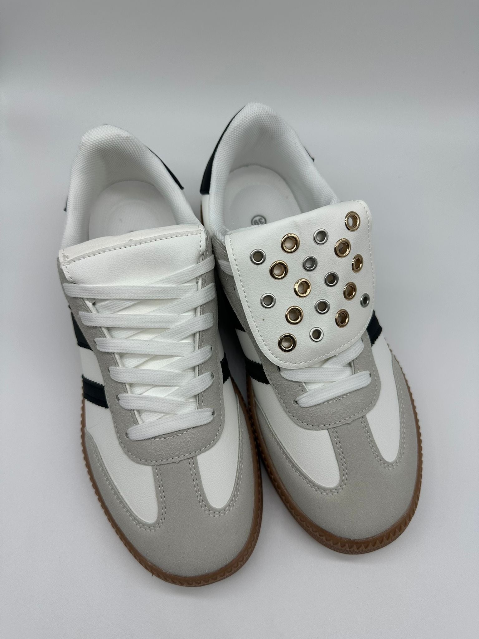 WHITE - Sneakers Sportive Donna Bianche e Grigie con Strisce Nere e Borchie.